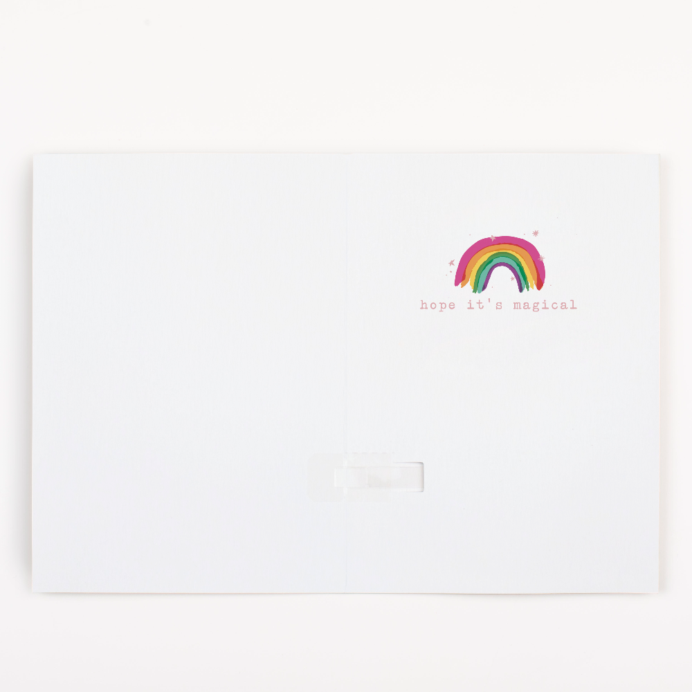 - Insert the card into the envelope; pull the tab from the spine to arm it.