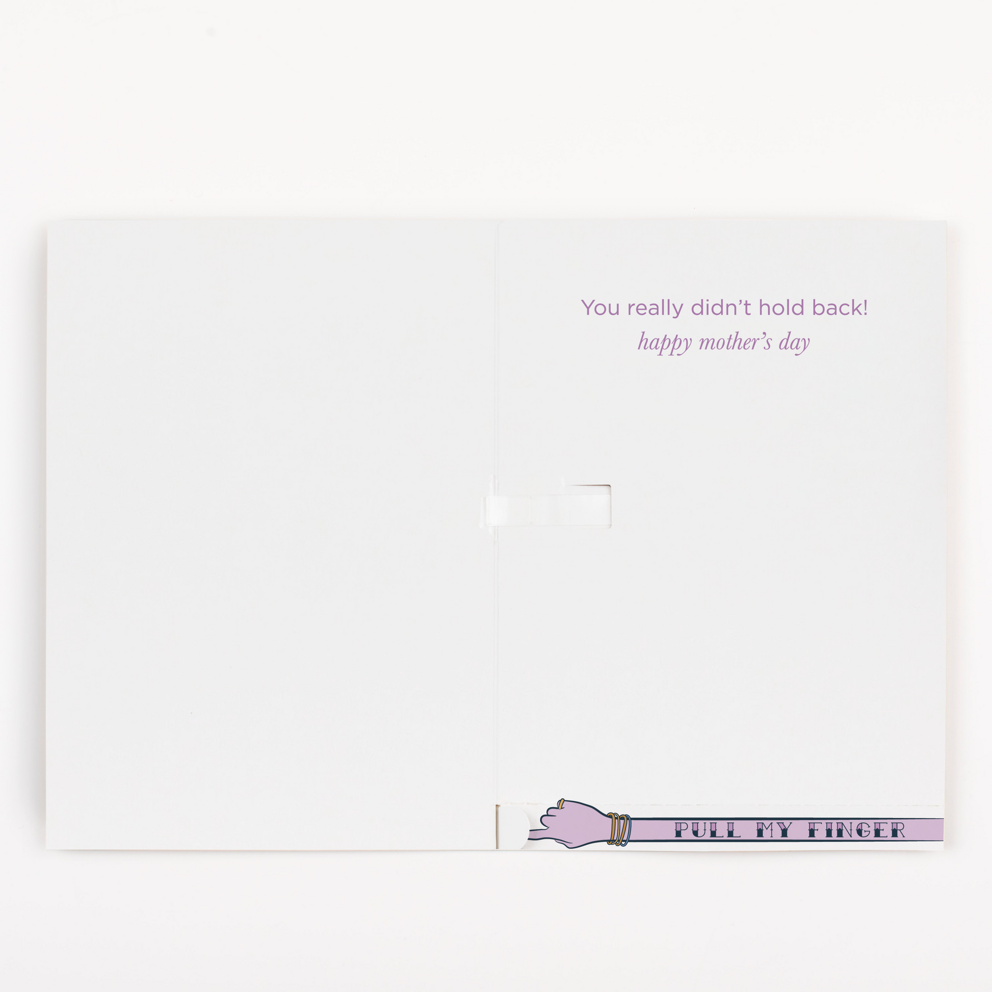 Inside the card at the bottom, there's a pull strip just waiting to be discovered. When mom pulls it, chunky glitter and stickers are released, creating a mess that's almost as funny as the sounds themselves.