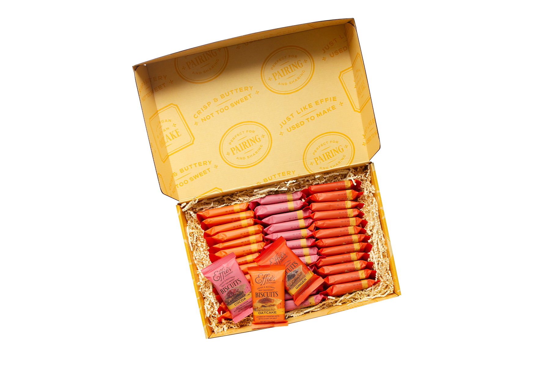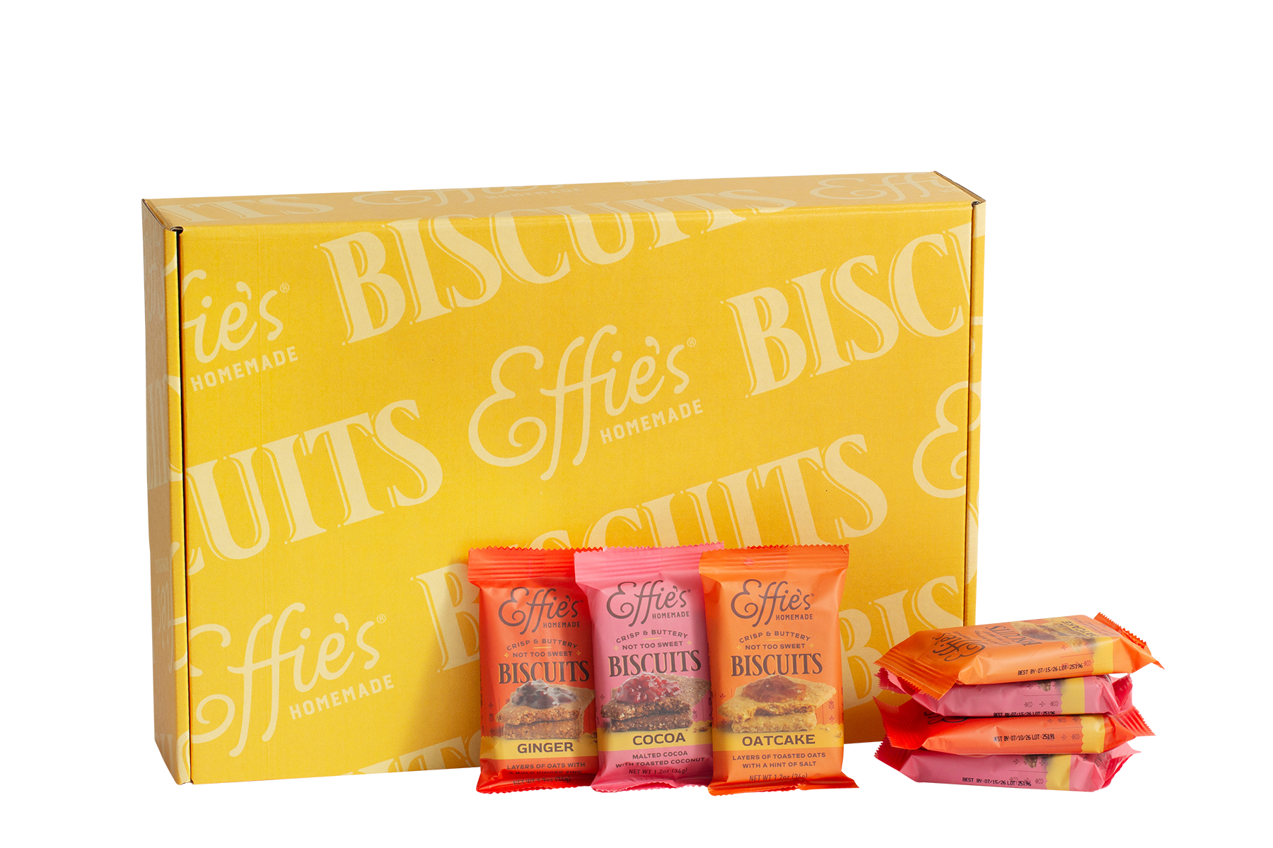 This thoughtfully packed box features 36 packages of two biscuits each — 12 each of our best-selling Oatcakes, Ginger Biscuits, and Cocoa Biscuits. Crisp, buttery, and just sweet enough, each single-serve pack is great for pairing, sharing, or savoring solo.