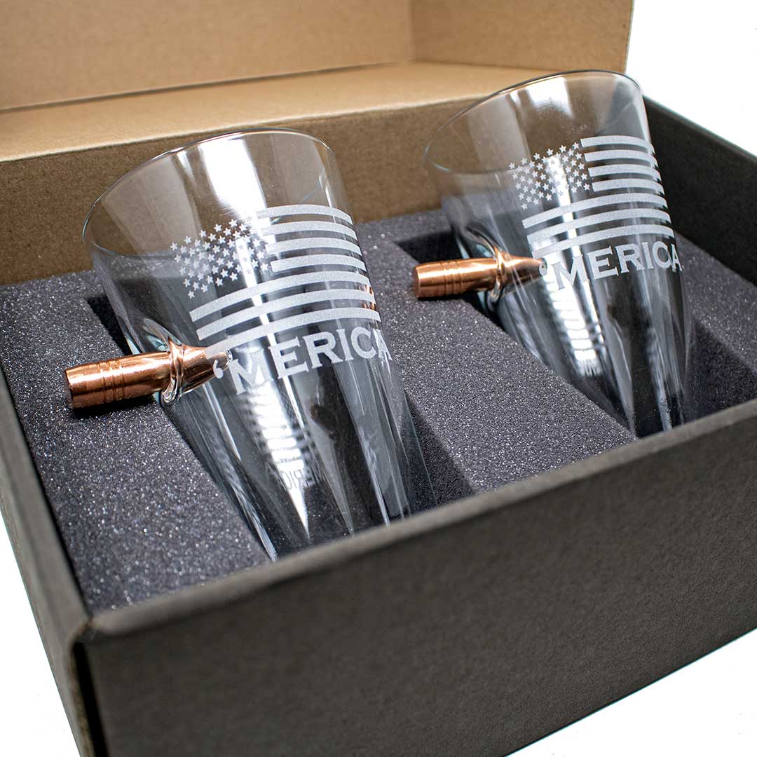 This 16oz beer pint glass is hand-embedded with a real, lead-free 0.50BMG bullet and laser etched with our best selling 'Merica design.
