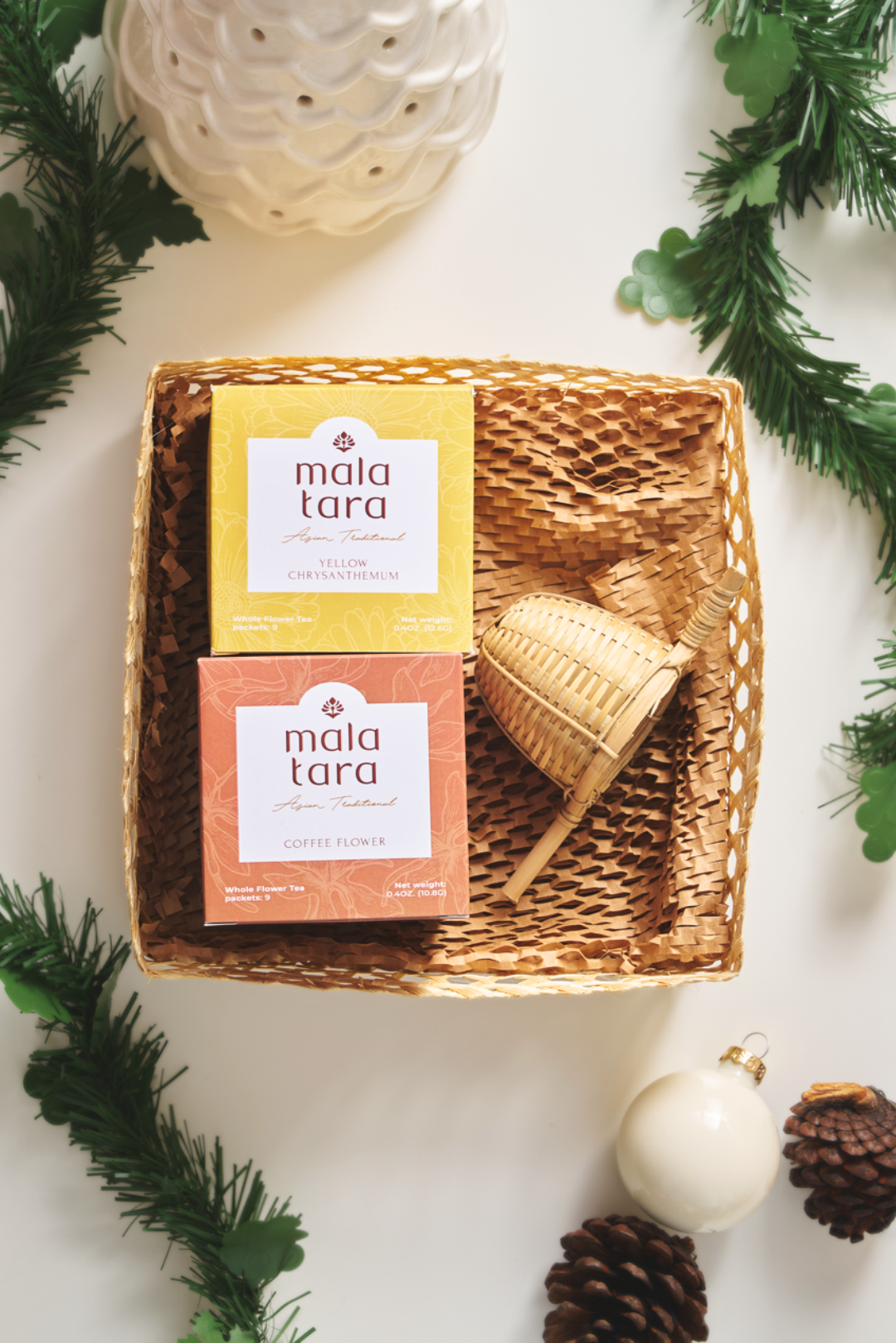 Elevate your tea rituals with the Serenity Deluxe Gift Box, designed for those who seek balance and mindfulness. This premium flower tea gift set includes two boxes of organic whole flower teas (your choice of flavors) and a hand-woven bamboo tea strainer, combining variety and eco-conscious brewing. The biodegradable bamboo strainer is both elegant and sustainable, making this the perfect gift for wellness enthusiasts or mindful tea drinkers. This herbal tea gift box is the perfect wellness gift for those who value sustainable and calming rituals.