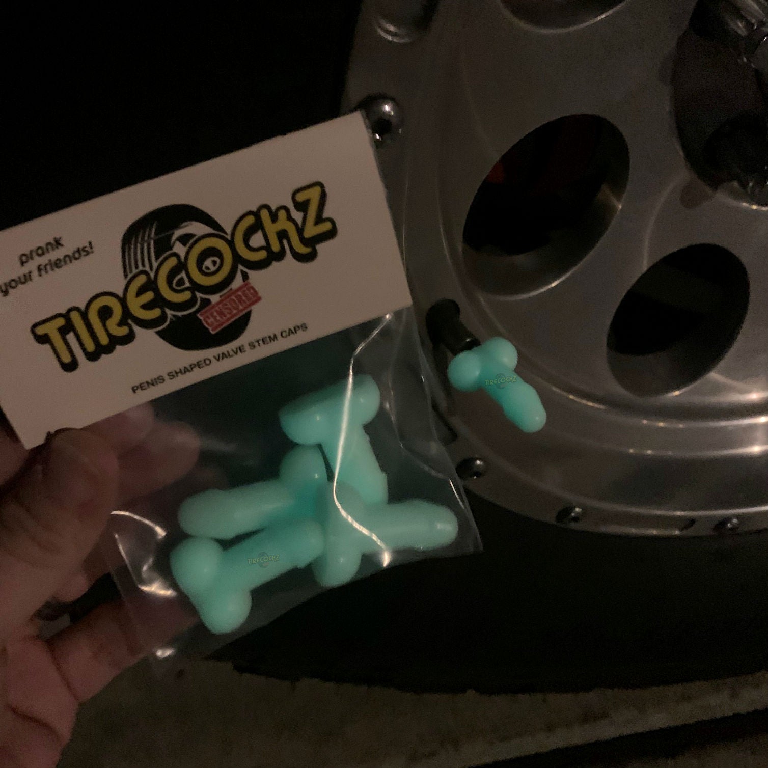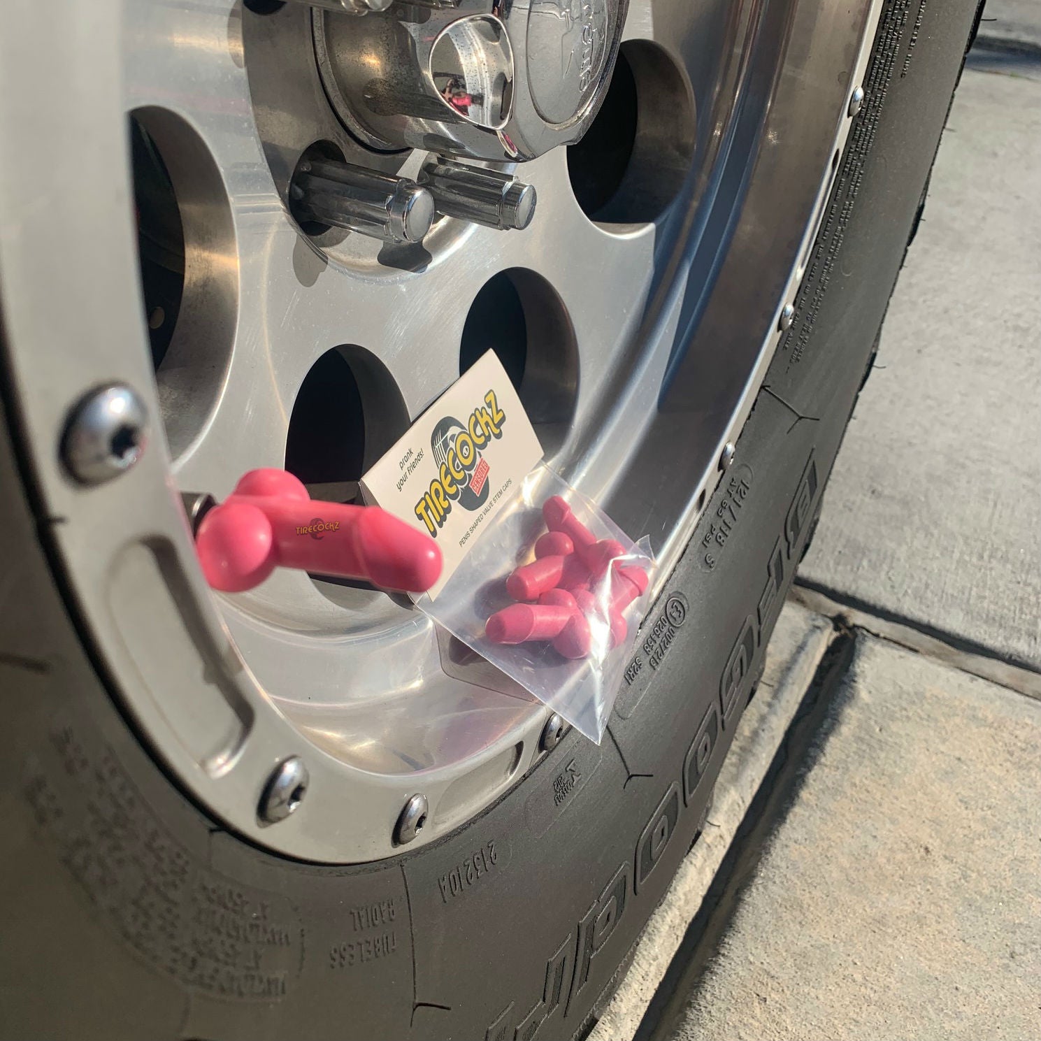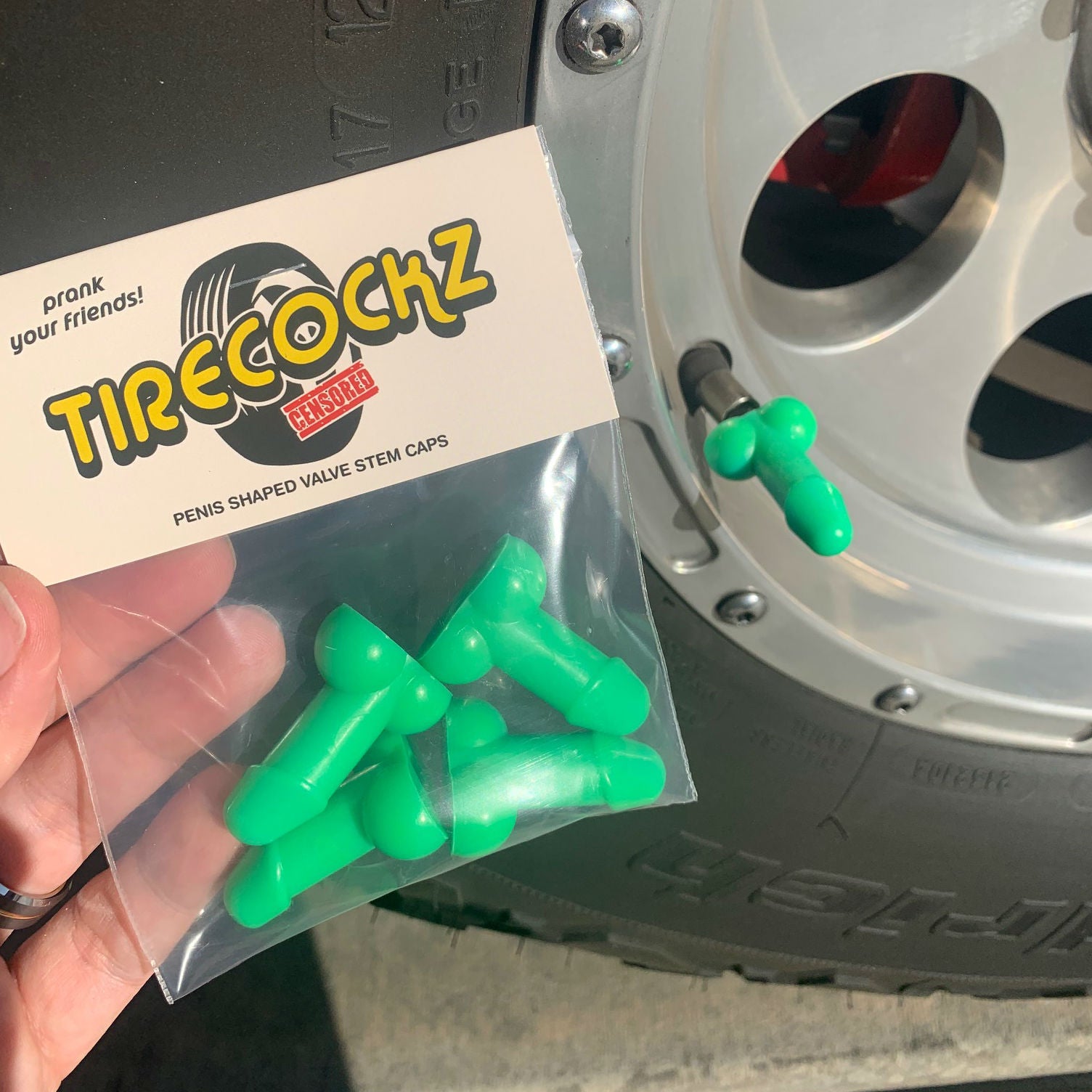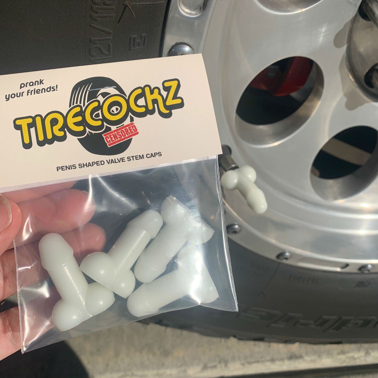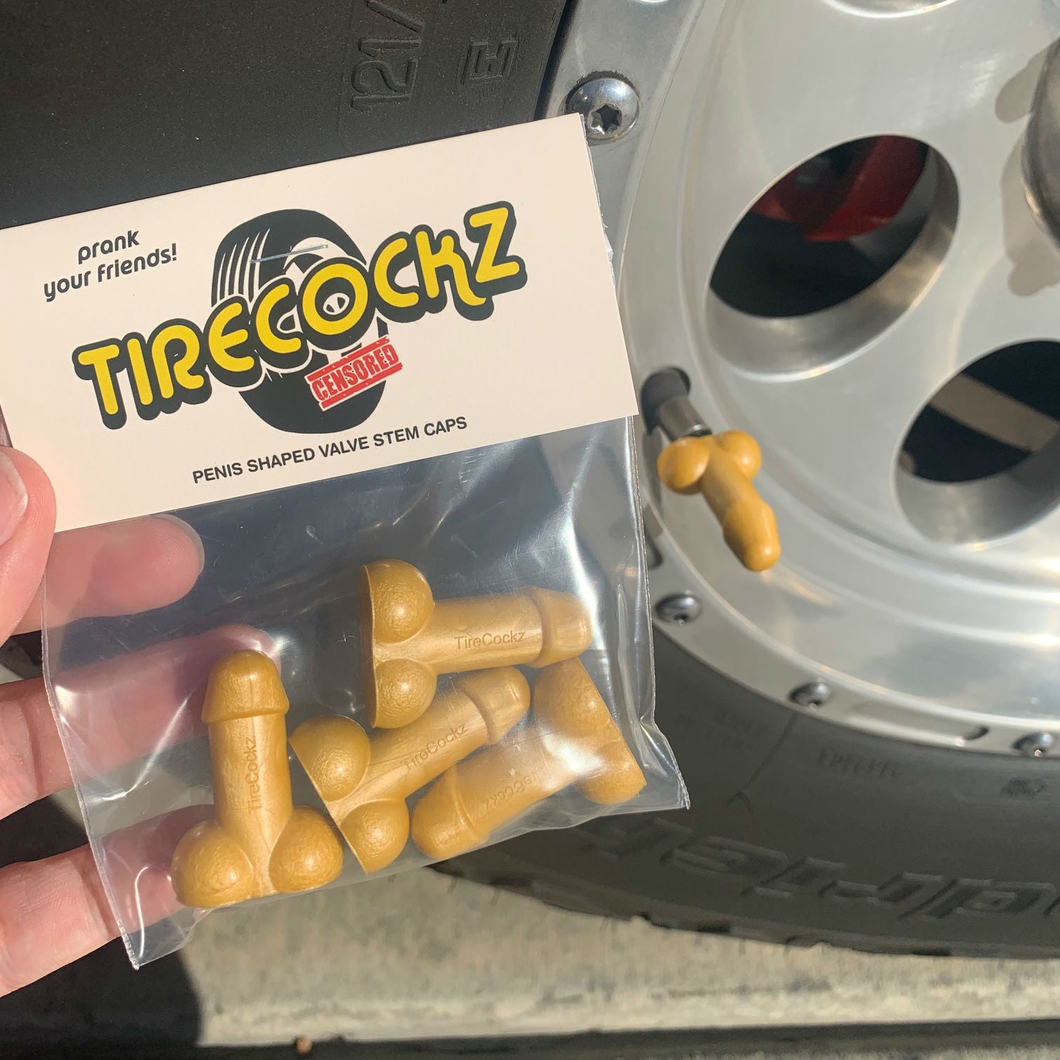 Description: May not be your standard 8-inches, but it’s bigger than any of your other hookups. What’s better than its length you ask? Being able to prank the sh*t out of your family and friends. Cover that valve stem cap with the beauty and the style known as “TireCockz.” These first ever weenie caps will have jaws dropping and minds blown (no literally). The perfect gift for any gathering: Bachelor/Bachelorette, Birthdays, Weddings, and hell even funerals. Now suck it up and purchase your very own TireCockz.