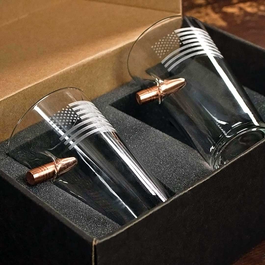 This 16oz beer glass is hand-embedded with a real, lead-free .50 caliber machine gun bullet and laser etched with a US Flag design.